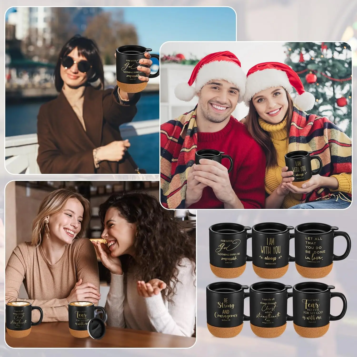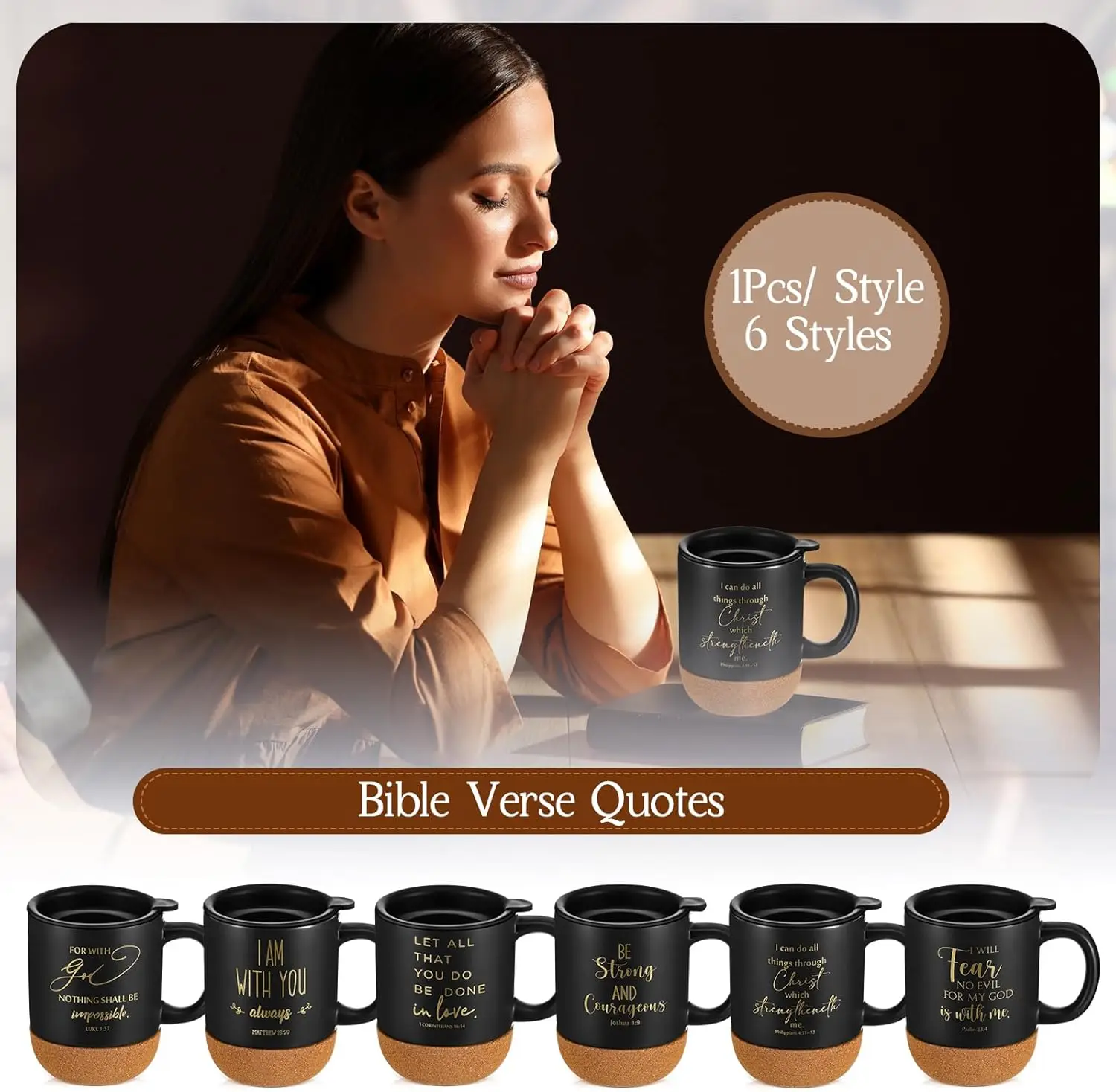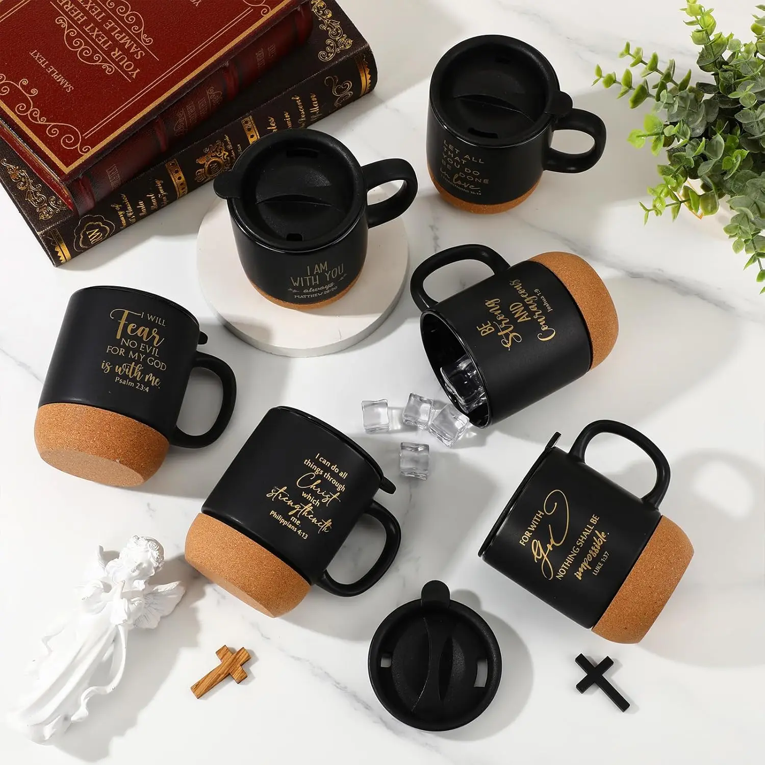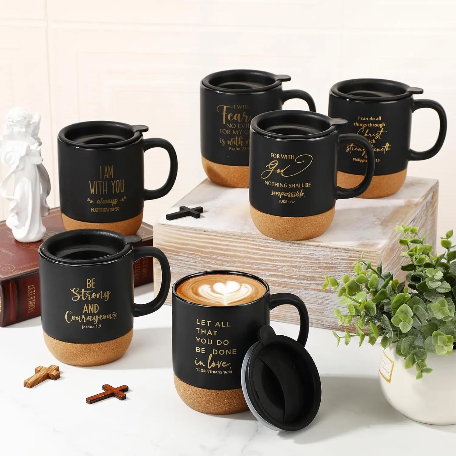 Discover our premium set of Christian coffee mugs designed to inspire and uplift. This package includes 6 ceramic mugs, each featuring unique Bible verses printed on the surface to provide daily encouragement and spread positivity. The cork bottom ensures durability and prevents slipping or breakage, making them perfect for everyday use at home or in professional settings like offices. Key Features: – **Sufficient Quantity**: Receive 6 high-quality ceramic mugs in one convenient set, ideal for personal use or gifting to family, friends, or church groups. – **Inspiring Design**: Each mug displays different biblical verses that serve as a source of motivation and faith reinforcement with every sip. – **Durable Construction**: Made from sturdy ceramic with a cork base for added stability and longevity; they resist chipping and are easy to clean. – **Generous Capacity**: Holds approximately 15 oz (450 ml) of your favorite beverages such as coffee, tea, or hot cocoa—perfect for enjoying without frequent refills. – **Versatile Gifting**: An excellent choice for various occasions including Easter, Christmas, Thanksgiving, Mother’s Day, Father’s Day, church events, or as appreciation gifts for pastors and clergy members. – **Elegant Aesthetics**: Features a sleek black finish that complements any decor style while adding a touch of religious inspiration to your space. Dimensions: Height is 4.13 inches with a top diameter of 3.35 inches—designed to be both functional and visually appealing. Whether you’re looking for meaningful gifts or enhancing your own collection of faith-based items these mugs offer practicality combined with spiritual enrichment.
